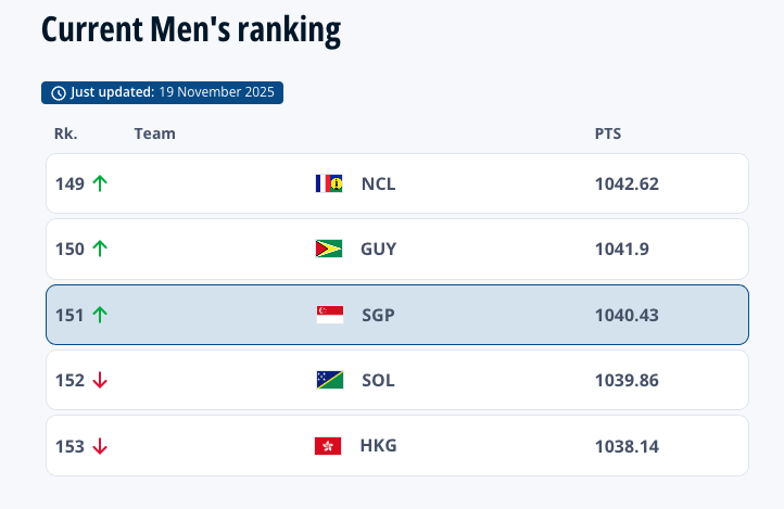 According to FIFA, Singapore currently ranks 151st in the world, moving up four spots from its previous rank at 155th.